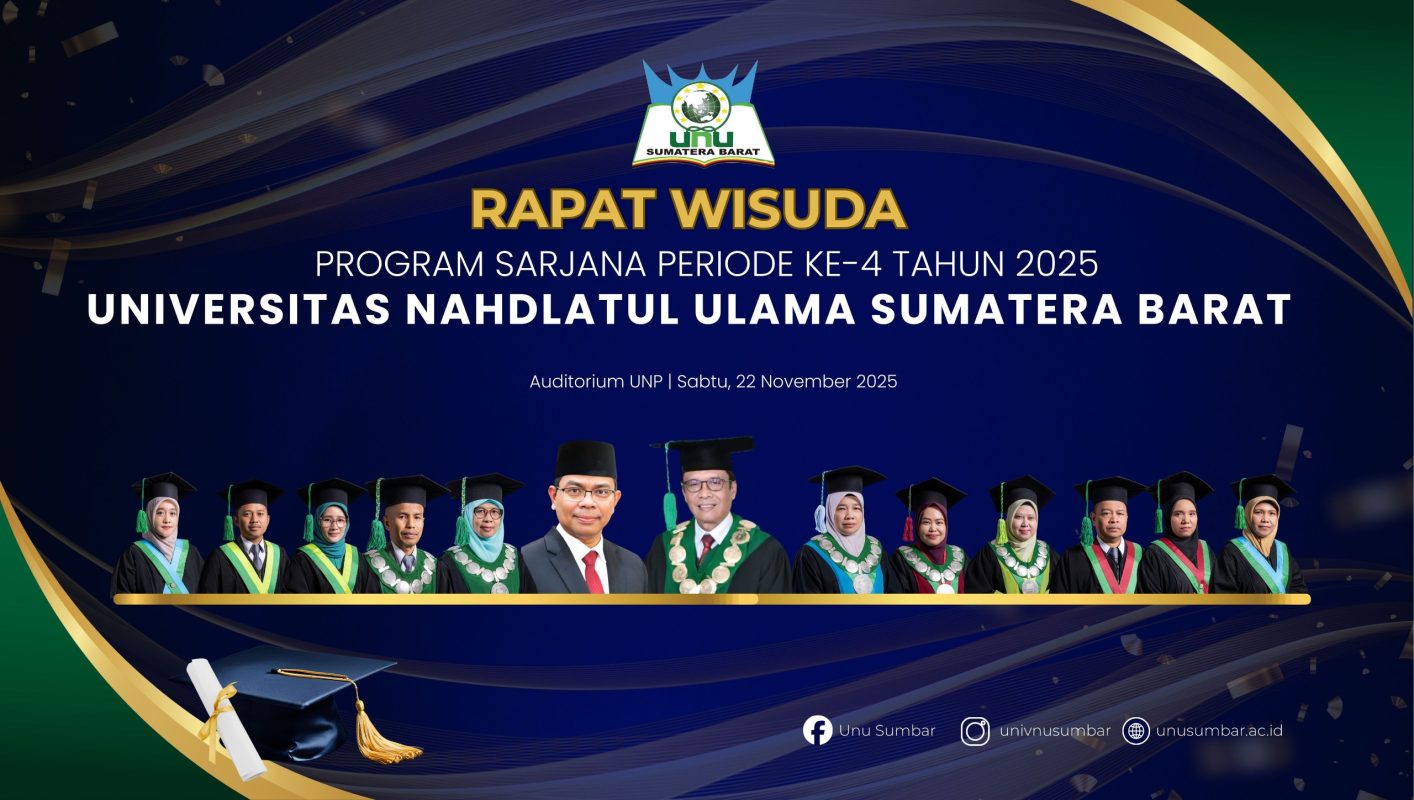 Alhamdulillah prosesi Wisuda periode ke-4 UNU Sumbar Tahun Akademik 2025/2026 telah berjalan dengan lancar. Kegiatan wisuda dihadiri Gubernur Provinsi Sumatera Barat yang diwakili Kabiro Kesra Bpk AL Amin, Kepala LLDIKTI Wilayah X yang diwakili oleh Ketua Tim Pendidik dan Tenaga Kependidikan bapak Eri Suryadi, Ketua PBNU yang diwakili oleh Rais Syuriah PWNU Sumbar, Ketua BPP UNU Sumbar Dr. Krismadinata, MT yang sekaligus Rektor UNP yang akan memberikan Orasi Ilmiah, dengan kesibukan yang luar biasa dari bapak-bapak dan ibu kita ini, mereka telah meluangkan waktu untuk menghadiri dan memberi semangat dan dukungan kepada UNU Sumbar yang akan melantik dan melepas secara resmi para sarjana baru untuk mengabdikan ilmu yang diperoleh mereka selama ini di UNU Sumbar kepada masyarakat, bangsa dan negara. Untuk itu atas nama UNU Sumbar, kami memberikan penghargaan yang tinggi dan terima kasih atas kehadiran bapak-bapak dan ibu dalam acara wisuda perdana UNU Sumbar ini.